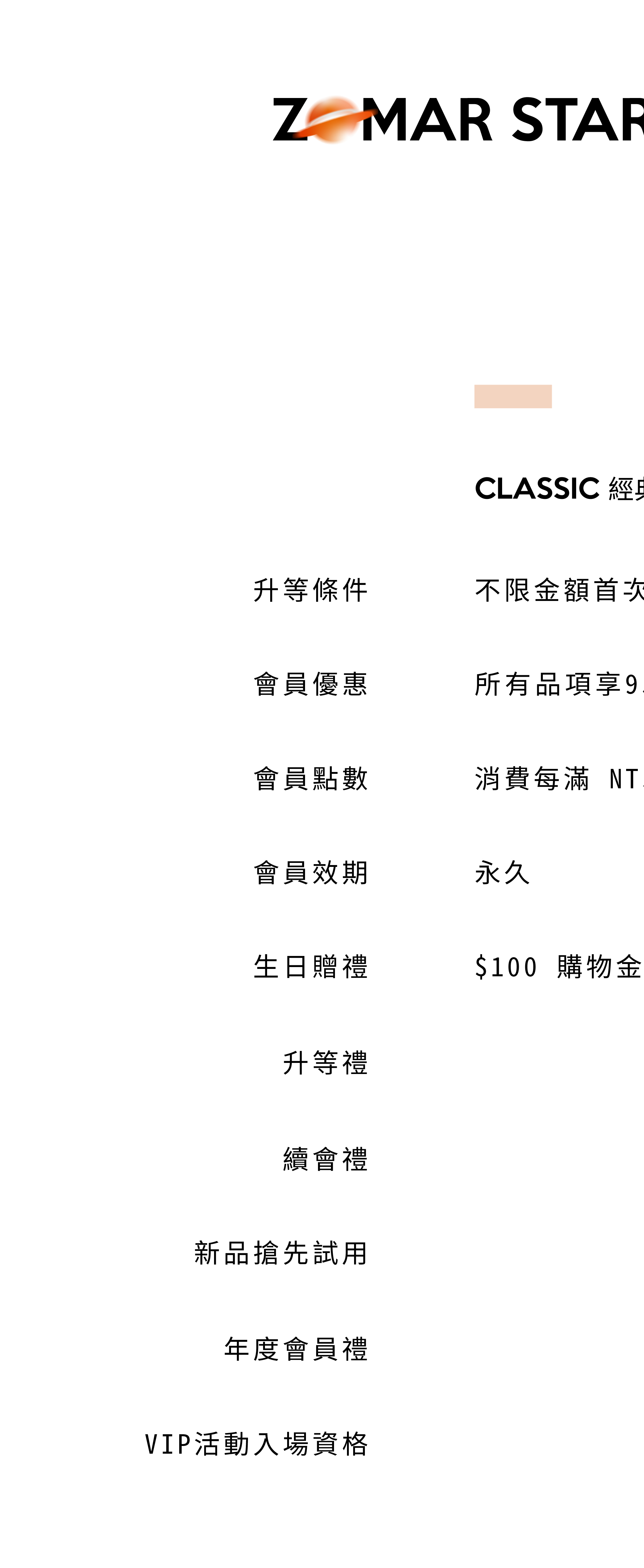 ZÖMAR STAR 共有 4 個會員級別,完成註冊後,將依 12 個月內的累積消費總額(不含運費、取消之訂單金額),升級為以下會員: